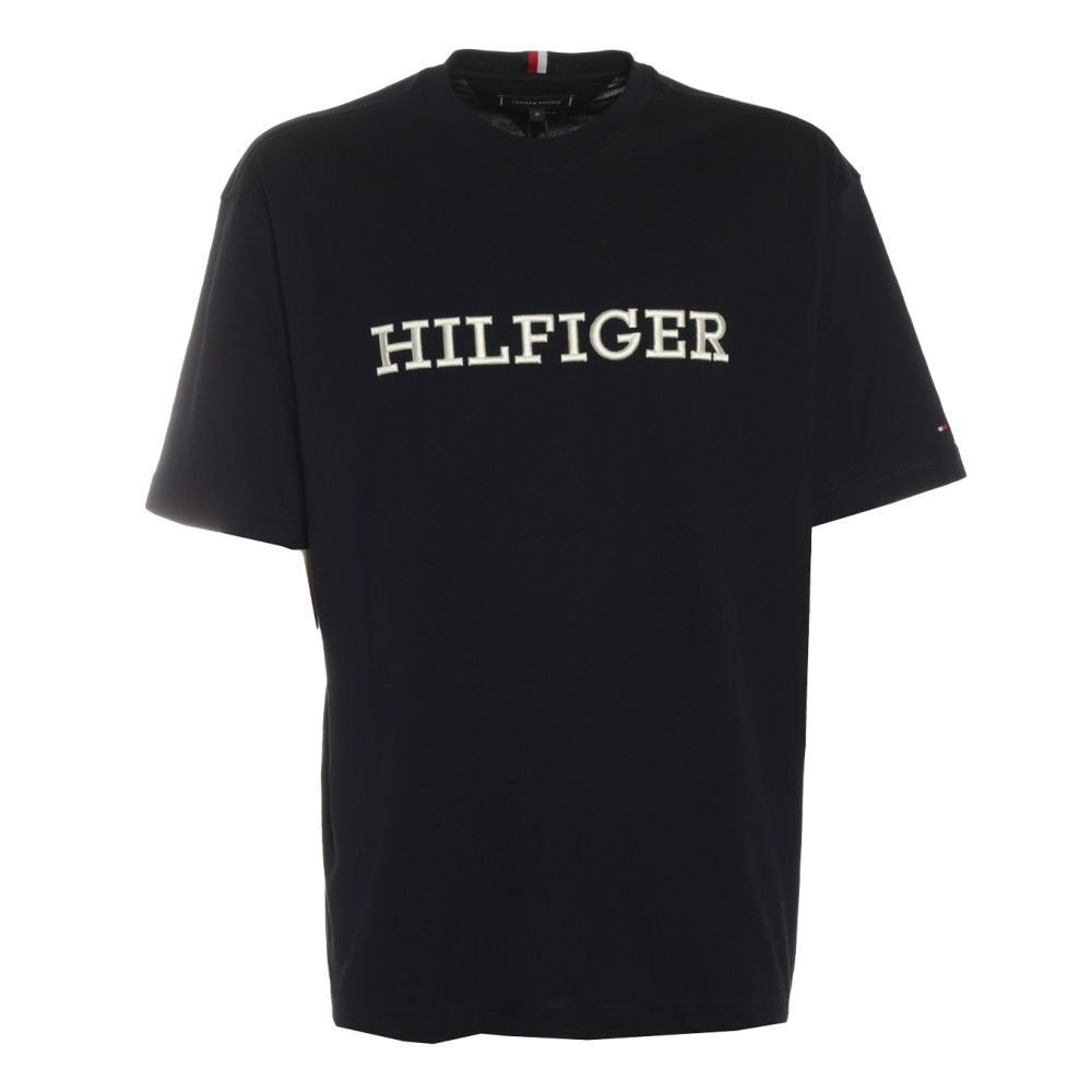 T-shirt blu con maxi scritta logo Hilfiger in rilievo sul davanti